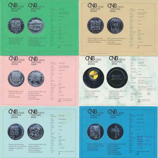 Certifikáty k českým pamětním mincím 1995-1999, 6 ks - špičková kvalita: Česká filharmonie, Svolinský, OSN, Šafařík, Millénium, Ú stava ČR (tato je opravená ze standartu)