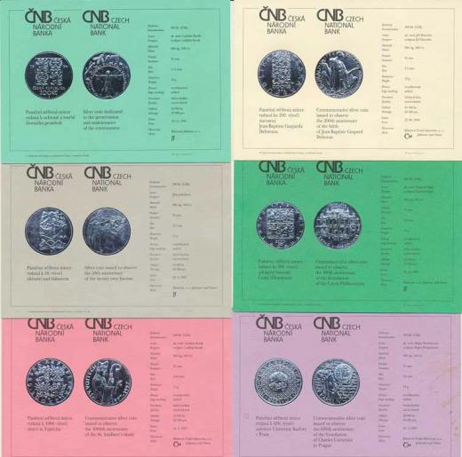 Certifikáty k českým pamětním mincím 1994-1998, různé 6 ks - běžn á kvalita: Životní prostředí, Fašismus, Česká filharmonie, Debura ua, sv. Vojtěch, Karlova univerzita (mír. ušpiněná)