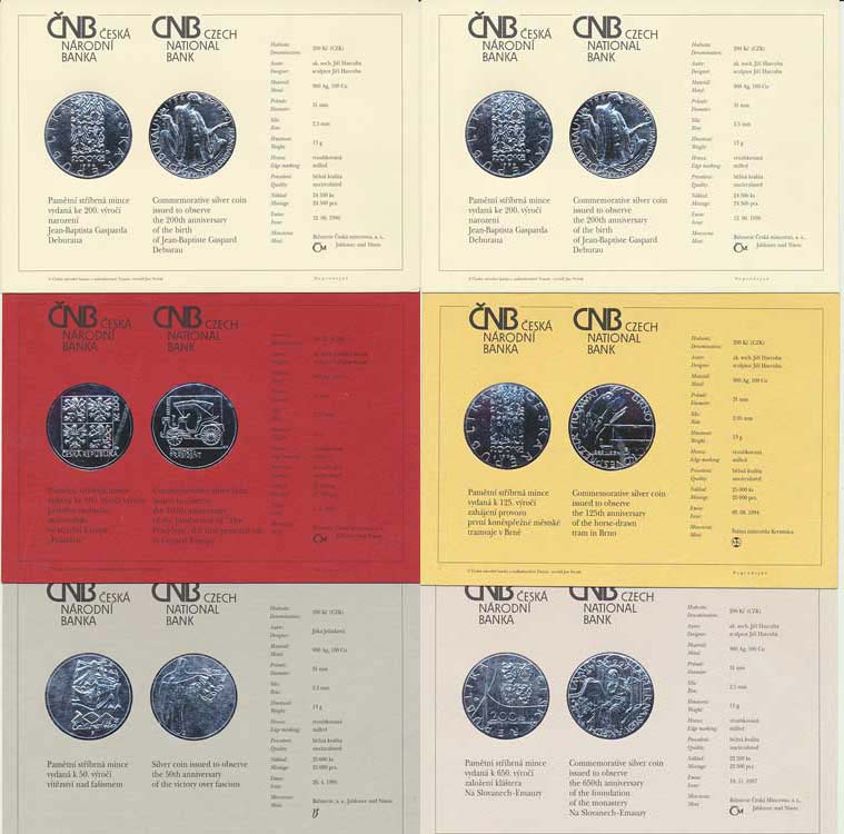 Certifikáty k českým pamětním mincím 1994-1997, různé 6 ks - běžn á kvalita: Fašismus, Koněspřežka, Emauzy, automobil, Deburau (2x)