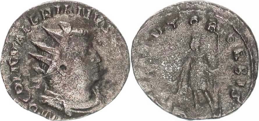 Antoninián, stoj.císař ve zbroji pozvedá klečící bohyni s hradebn í korunou RESTITVTOR ORBIS Kank: 25; RIC: 116ff; podob ný Sear: 2795