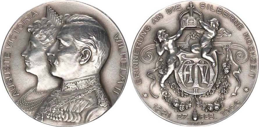 Medaile 1906 na stříbrnou svatbu Wilhelma a Augusty Viktorie, dvo jportrét zleva, opis / Nad štítem s iniciály nesou dva Putti koru nu, opis sign.: M. & W. ST Ag 950 33,5 mm 15,73 g
