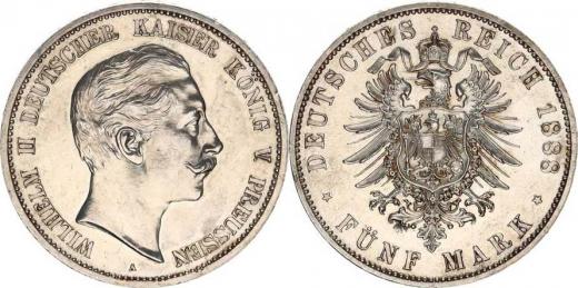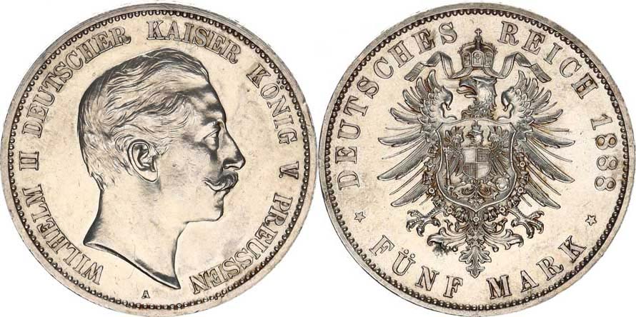 5 Mark 1888 A KM 513 "RR" /raž. jen 56 000 ks !/ 27,803 g "vyjímečný stav"