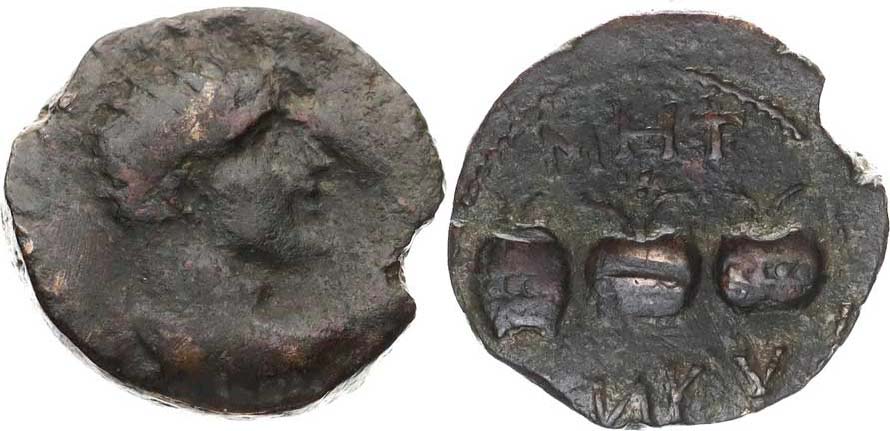 AE 24, koloniální bronz - Galatia-Ancyra, A: Portrét zprava, opis / 3 výherní urny, každá má dvě ratolesti MHT / ANKV minc. Ank ara SNG Cop 120; podob. SGI: 4503_hrana ražbou