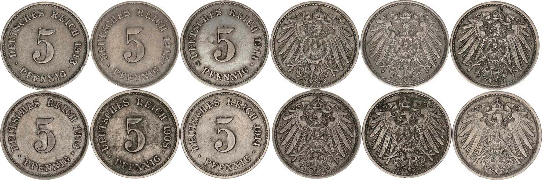 5 Pfennig 1908 G, 1913 E, G, 1914 E(2x), F 6 ks