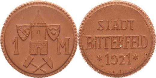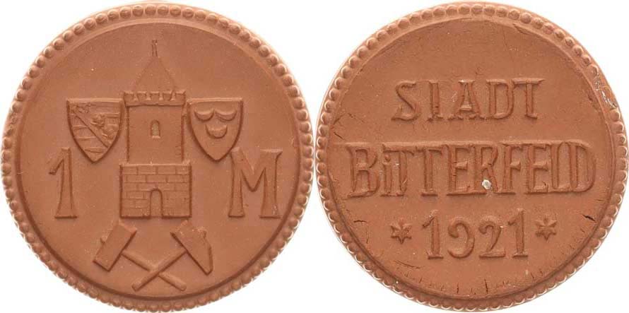 Bitterfeld - 1 M 1921 míšeňský hnědý porcelán 29,7 mm 4,176 g Menzel 2005 / 2923.1