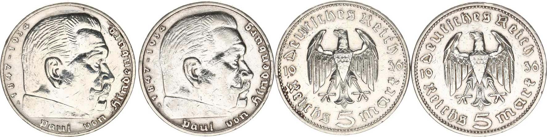 5 RM 1936 A - Hindenburg bez svastiky 2 ks