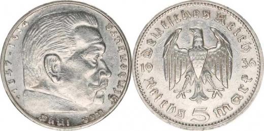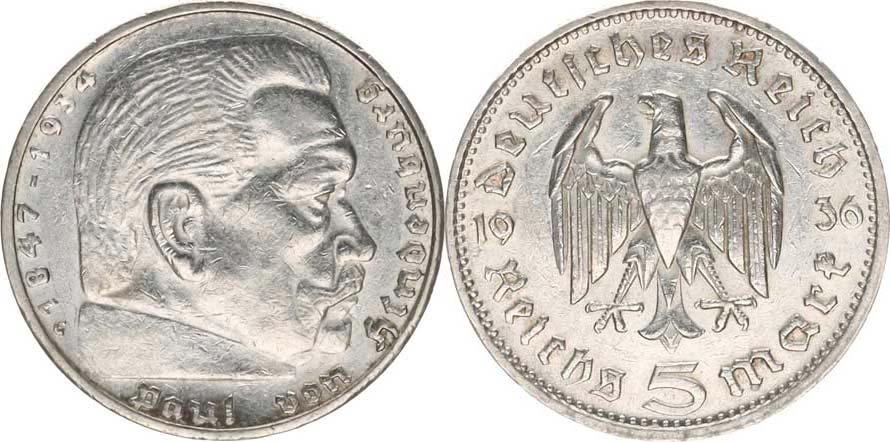 5 RM 1936 G - Hindenburg bez svastiky "R"