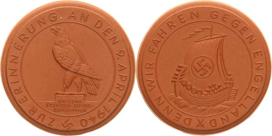 Upomínka na 9. 4. 1940, Sedící orel a opis / Vikingská plachetnic e se svastikou na plachtě, opis: DENN WIR FAHREN GEGEN ENGELLAND hnědý porcelán 50,5 mm "RR" Scheuch 1870