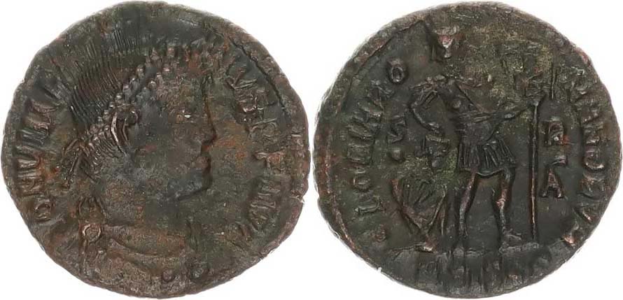 AE 17, kráčející císař nese labarum a vleče zajatce za vlasy GLORIA ROMANORVM mincovna Siscia 2,22 g KAMP. s.450, č. 155.40.1