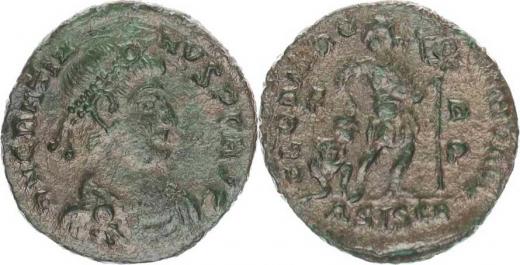 AE 17, kráč. císař vleče zajatce za vlasy a drží standartu, napra vo písmena D/P GLORIA ROMANORVM - SISC minc. Siscia RIC: 14c; Sear: 4042; C: 23; Kank.: 5