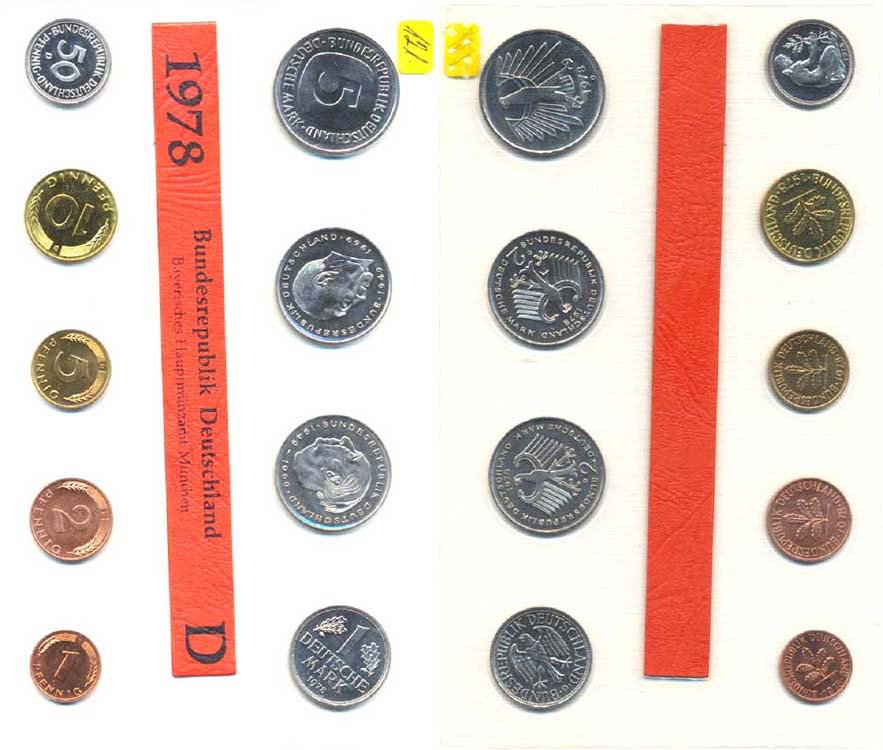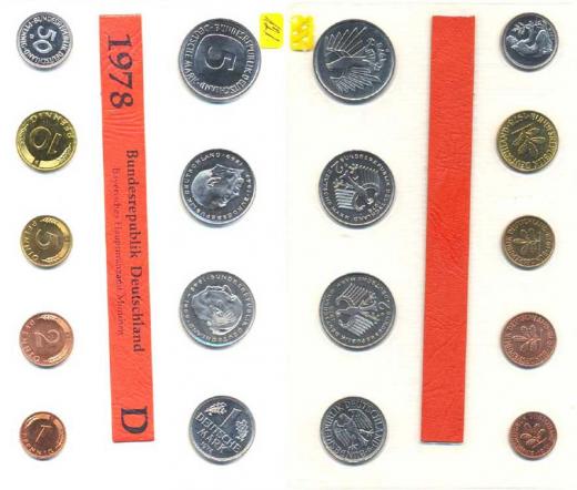 Ročníková sada mincí 1978 minc. D (1, 2, 5, 10, 50 Pf., 1, 5, 2 DM - Adenauer, Heuss) 9 ks zataveno v orig. folii mincovny MS 17