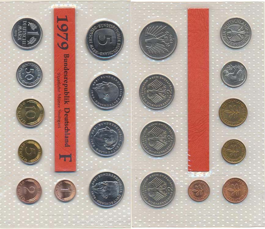 Ročníková sada mincí 1979 minc. F (1, 2, 5, 10, 50 Pf., 1, 5, 2 DM - Adenauer, Heuss, Schumacher) 10 ks zataveno v orig. foli i mincovny MS 22
