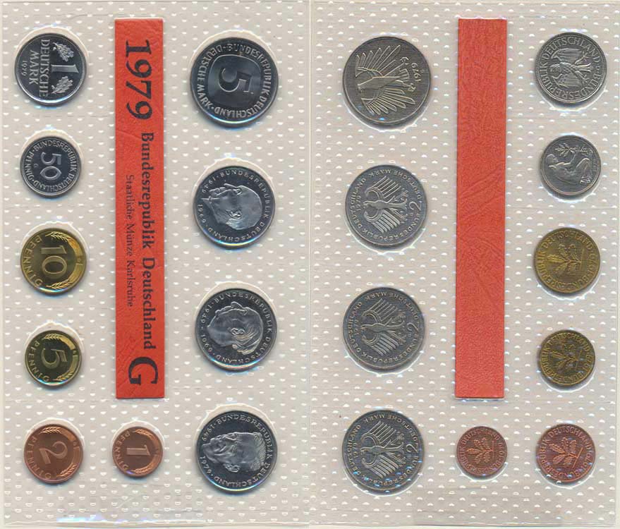 Ročníková sada mincí 1979 minc. G (1, 2, 5, 10, 50 Pf., 1, 5, 2 DM - Adenauer, Heuss, Schumacher) 10 ks zataveno v orig. foli i mincovny MS 23