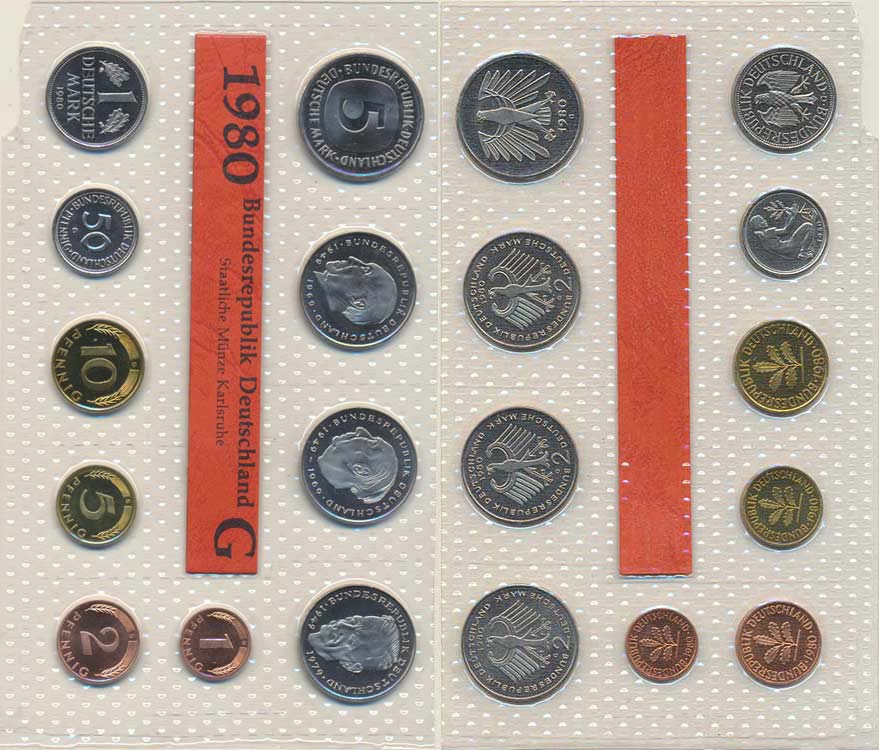Ročníková sada mincí 1980 minc. G (1, 2, 5, 10, 50 Pf., 1, 5, 2 DM - Adenauer, Heuss, Schumacher) 10 ks zataveno v orig. foli i mincovny MS 27_mírně poškoz. folie