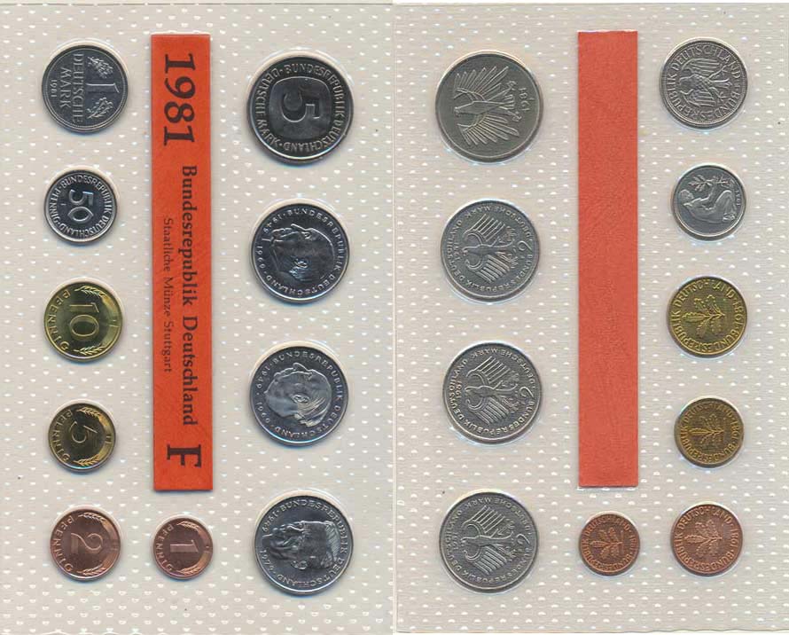 Ročníková sada mincí 1981 minc. F (1, 2, 5, 10, 50 Pf., 1, 5, 2 DM - Adenauer, Heuss, Schumacher) 10 ks zataveno v orig. foli i mincovny MS 30