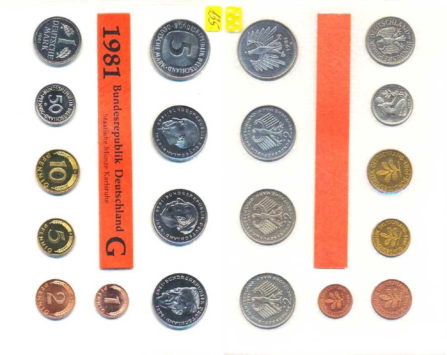 Ročníková sada mincí 1981 minc. G (1, 2, 5, 10, 50 Pf., 1, 5, 2 DM - Adenauer, Heuss, Schumacher) 10 ks zataveno v orig. fol ii mincovny MS 31