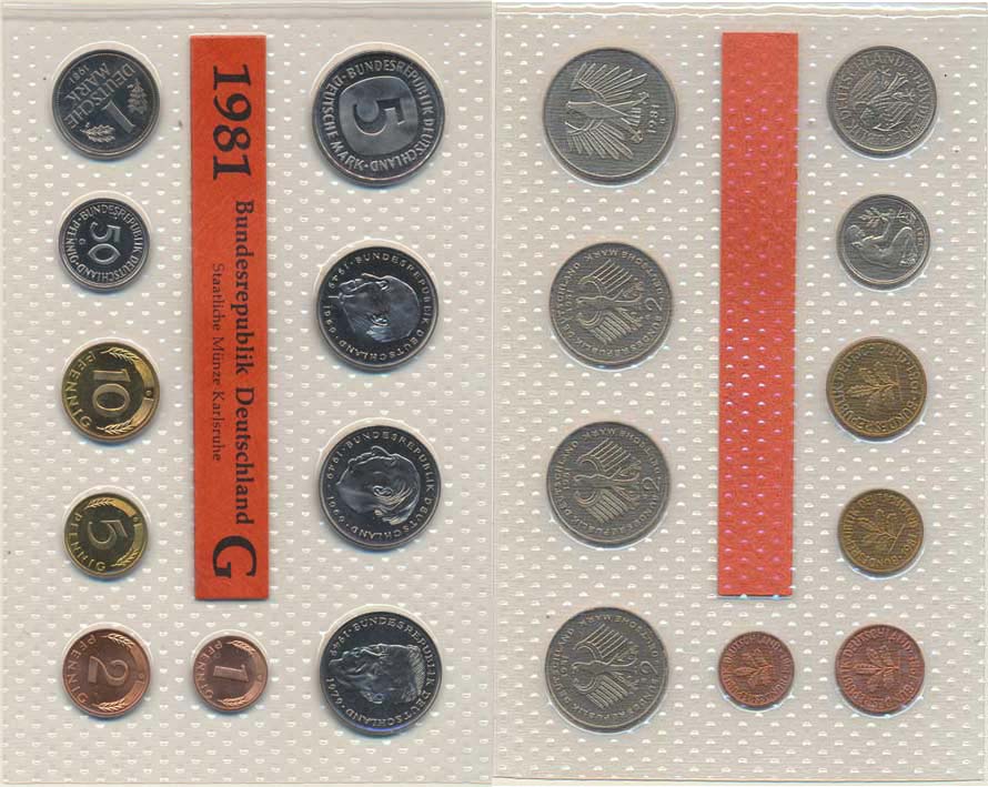 Ročníková sada mincí 1981 minc. G (1, 2, 5, 10, 50 Pf., 1, 5, 2 DM - Adenauer, Heuss, Schumacher) 10 ks zataveno v orig. fol ii mincovny MS 31