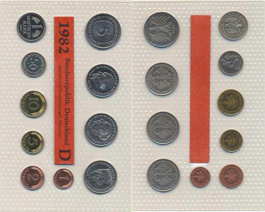 Ročníková sada mincí 1982 minc. D (1, 2, 5, 10, 50 Pf., 1, 5, 2 DM - Adenauer, Heuss, Schumacher) 10 ks zataveno v orig. foli i mincovny MS 33