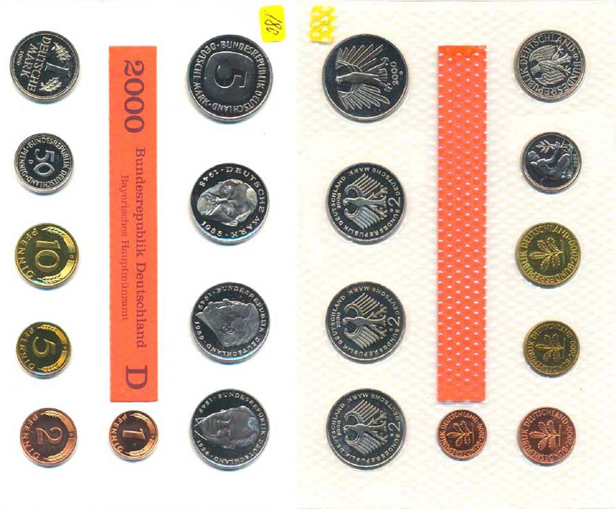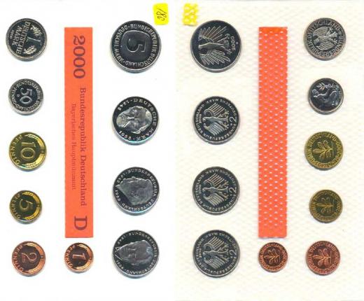 Ročníková sada mincí 2000 minc. D (1, 2, 5, 10, 50 Pf., 1, 5, 2 DM - Eberhart, Strauss, Brandt) 10 ks zataveno v orig. folii mincovny MS 115_mince jsou v obalu uvolněny