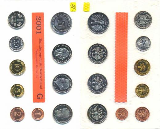 Ročníková sada mincí 2001 minc. G (1, 2, 5, 10, 50 Pf., 1, 5, 2 DM - Eberhart, Strauss, Brandt) 10 ks zataveno v orig. folii mincovny MS 122