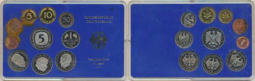 Ročníková sada mincí 1981 minc. F (1, 2, 5, 10, 50 Pf., 1, 5, 2 DM - Adenauer, Heuss, Schumacher) 10 ks v orig. plexi balení mincovny PS 61_oxyd. 1 mince