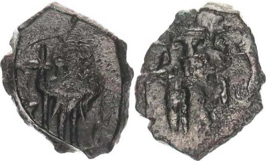 AE 1/2 follis (14-19 mm), A: Stoj. císař s dlouhým vousem, ve voj enském oděvu, drží dlouhý kříž, druhu ruku v bok / Konstantin IV ., Heraclius a Tiberius každý s křížem na zeměkouli minc. Constantinopol Sear Byz 1011; MIB 175.