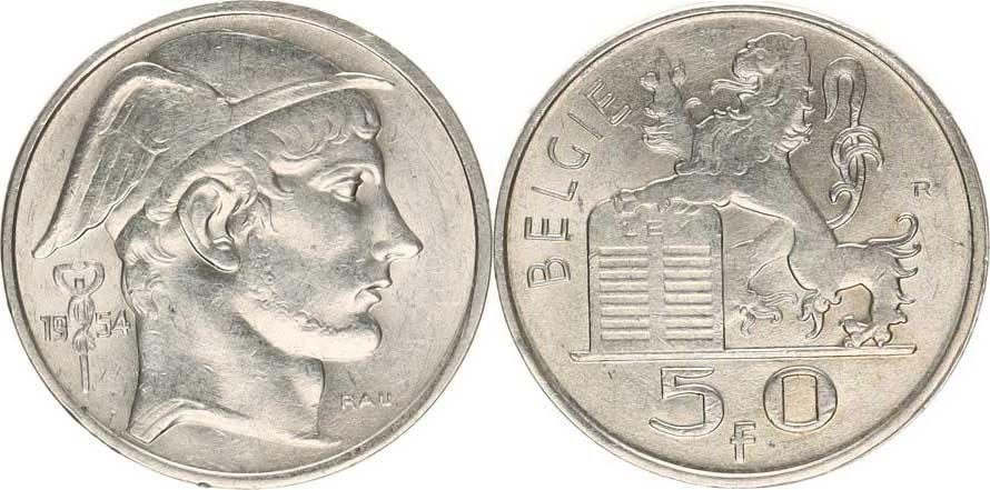 50 Francs 1954 opis BELGIE - hlava Merkura KM 137 Ag 835 12,5 g