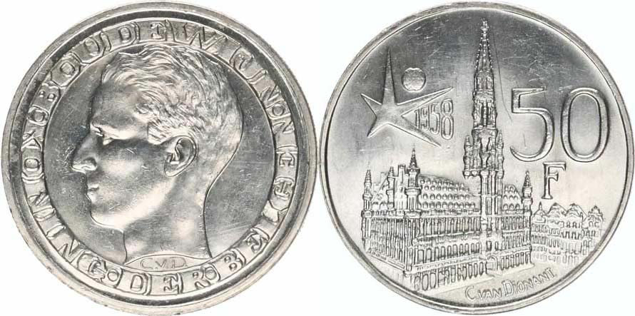 50 Francs 1958, DER BELGEN - EXPO Brusel KM 151,2 Ag 835 12,5 g