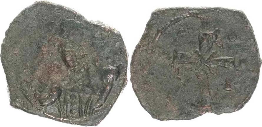 AE Tetarteron (22 mm), Korunované poprsí drží kříž, žezlo a globu s / zdobený dutý kříž s X uprostřed, v 1/4 kříže písmena DOC 40; Sear 1931; Ratto: 2085 "R"