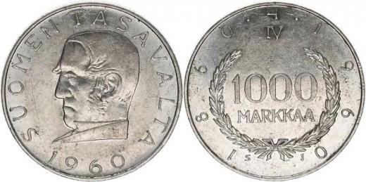 1 000 Markkaa 1960 SJ - Snellman, 100. výročí KM 43 "R" Ag 875 14,00 g