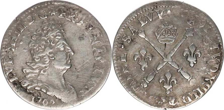 5 Sols (1/16 ecu) 1702 minc. Pau - přeražba z r. 1692 Ciani 1965, KM 337