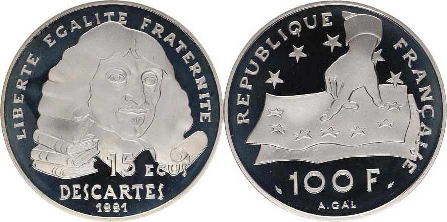 100 Francs=15 Ecus 1991 - Descartes KM 996 Ag 900 22,20 g kapsle +certifikát