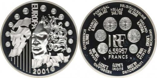 6,55957 Francs 2001 - Evropa KM 1265 Ag 900 22,2 g kapsle