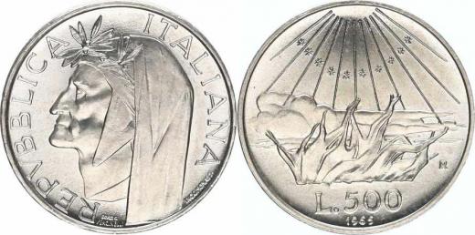 500 Lire 1965 R - Dante KM 100 Ag 835 11,00 g