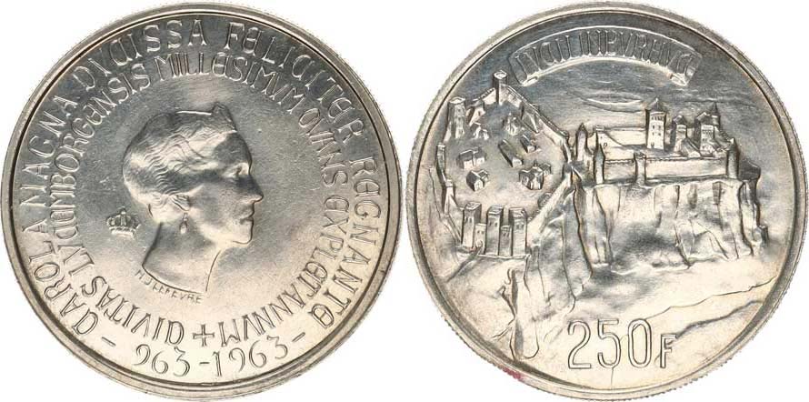 250 Francs 1963 - Millenium města Lucemburk KM 53,1 Ag 835 25,093 g "R" (pouze 20 000 ks)