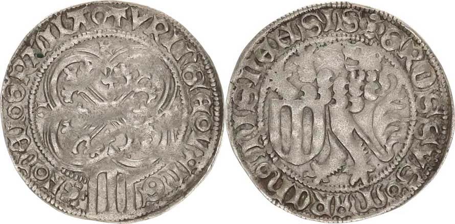 Groš štítový b.l. (1428-44), minc. Freiberg Krug 736/7 opi s začíná čtyřlistou růžicí s trny 2,603 g