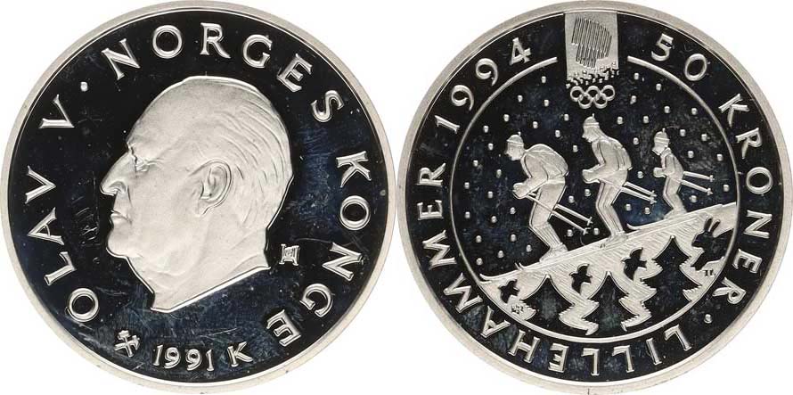 50 Kroner 1991 - OH Lillehammer 1994 - tři lyžaři KM 431 Ag 925 16,81 g