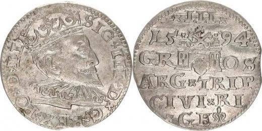 III groš 1594, Riga-Wulf opis: SIG+III+D+G+REX+PO+D+LI / před G místo tečky + (+GE minc. zn.) jako Zag. 396; Kop. II/I/7; 1,983 g