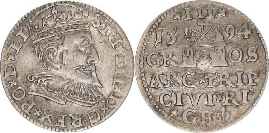 III groš 1594, Riga-Wulf opis: SIG+III+D+G+REX+PO+D+LI / před G místo tečky + (+GE minc. zn.) jako Zag. 396; Kop. II/I/7; 2,245 g