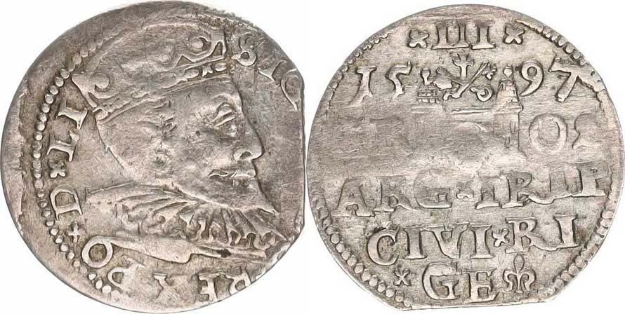 III groš 1597 Riga, Wulf var.: bez tečky za LI jako Kop. II., s.242 I./10; Iger R.97 2,044 g _kraj střížku, část nedor. rv.