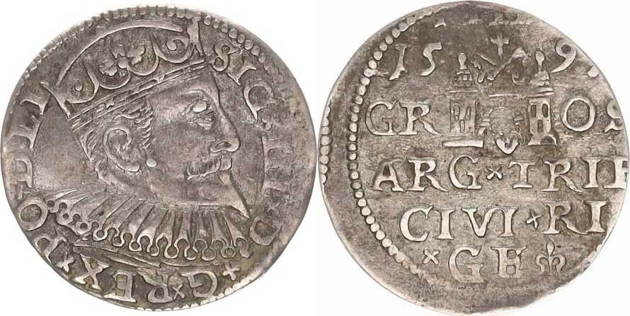 III groš 1597 Riga, Wulf - var.: poprsí přerušuje opis mezi D - + G+ REX+, bez tečky za LI jako Kop. II., s.242 I./10; Iger R.97 "R" 2,403 g _mírně exc., tém.