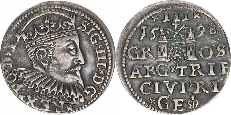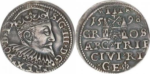 III groš 1598 Riga, Wulf - var.: mezi D : G (dvojtečka) Zag. 396; Iger R.98 2,526 g "pěkná patina"