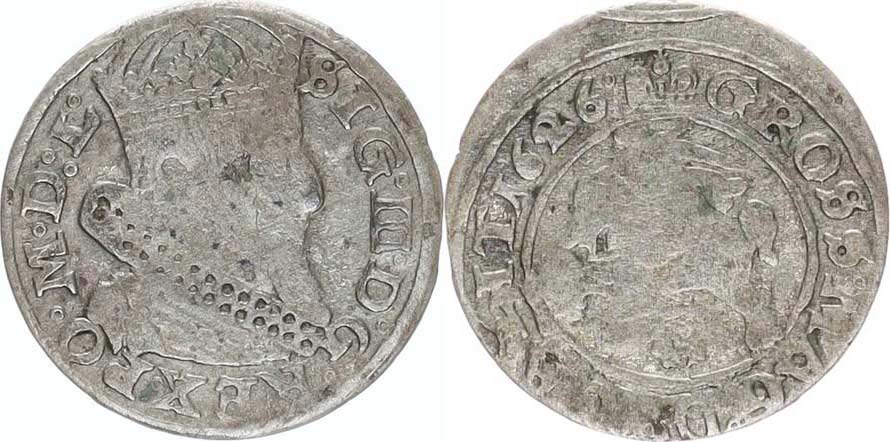Groš litevský 1626, Wilno-Naruszewicz, konce opisu: L / LIT . v Rv. rozděl. zn. jsou kroužky, i za datací ° Zag. 354; Kopicki 3504(R4), Kamiński-Kurpiewski 2104 0,898 g
