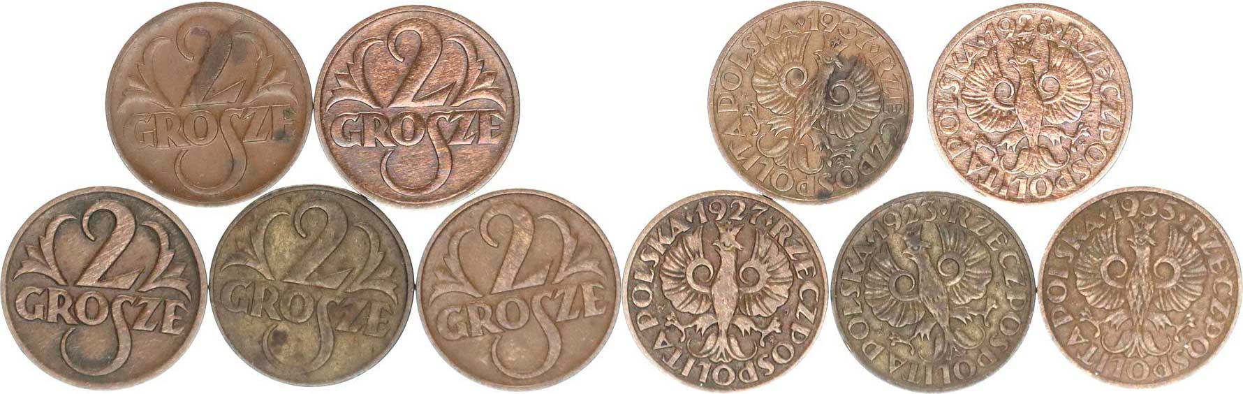 2 Grosze 1923 mosaz, 1927, 1928, 1935, 1937 5 ks