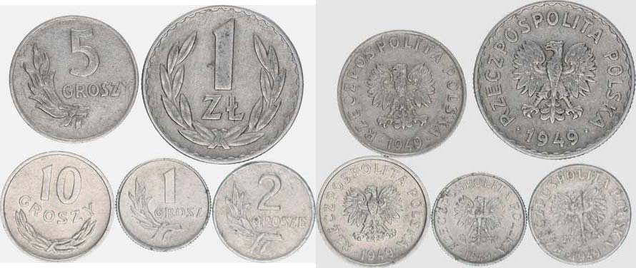 1, 2, 5, 10 Grosz 1949, 1 Zloty 1949 vše Al 5 ks