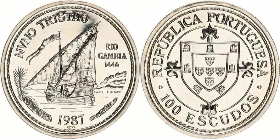 100 Escudos 1987 - Nuno Tristao , plachetnice KM 640a Ag 925 16,50 g