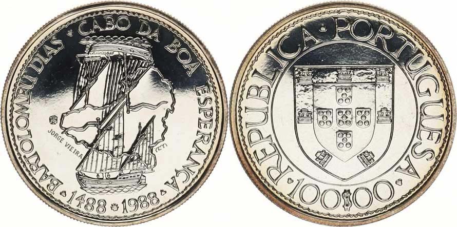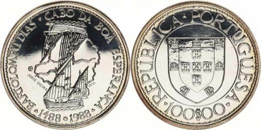 100 Escudos 1988 - Bartolomeu Diaz, plachetnice KM 642a Ag 925 16,50 g