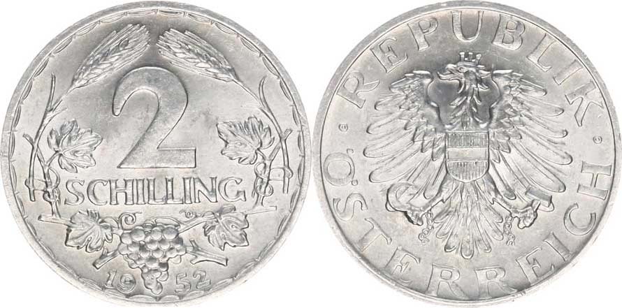 2 Schilling 1952 KM 2872; Schön 71 "RR" (pouze 14 9 000 ks !)