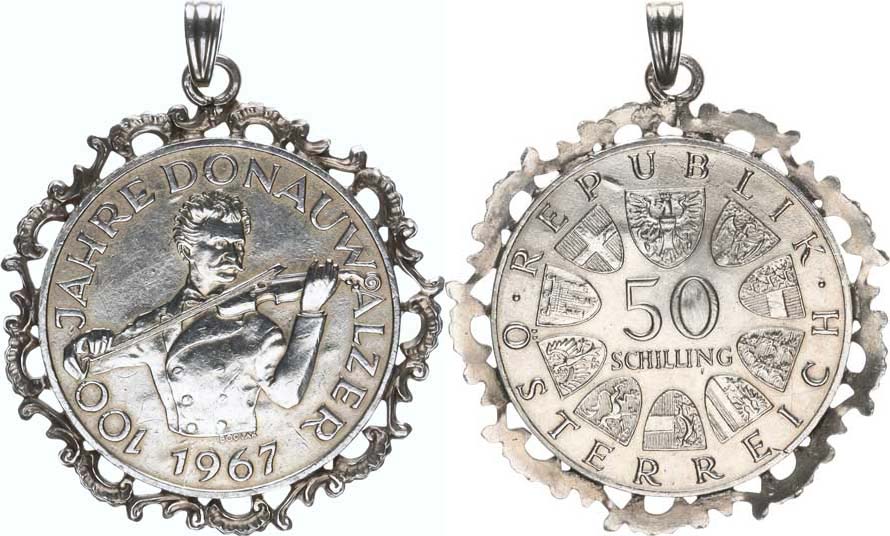 50 Schilling 1967 - Donauwalzer KM 2902 zasazený do ozdob ného rámečku s ouškem a závěsem 23,35 g