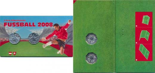 5 Euro 2008 - fotbal, Wien/Salzburg/Genf/Zürich KM 3163 5 Euro 2008 - fotbal, Bern/Basel/Insbruck/Klagenfurt KM 3164 Ag 800 10,00 g 2 ks baleno ve společném blistru (100 000 ks)